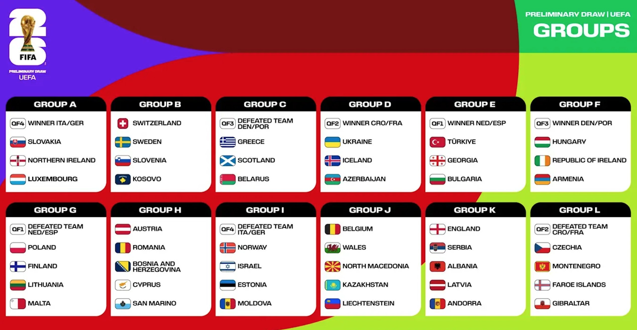 2024年12月13日,欧洲区预选赛进行了分组抽签。但由于要执行欧预赛与欧国联的双线并行,确保比赛能够同步推动,,最终抽签结果只待欧国联1/4决赛完赛。