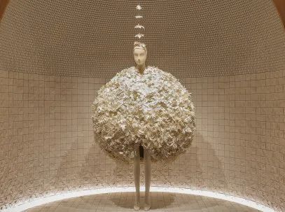 一件是向蓟花致敬的球形裙子,由8位刺绣工匠采用124,000颗玻璃珠、59,000块亮片在刺绣棉质面料和chiné桑蚕丝混纺面料上精心打造,耗时1,000个小时。