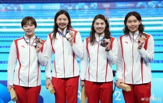 万乐天(左一)与队友参加奥运会颁奖仪式(新华社)