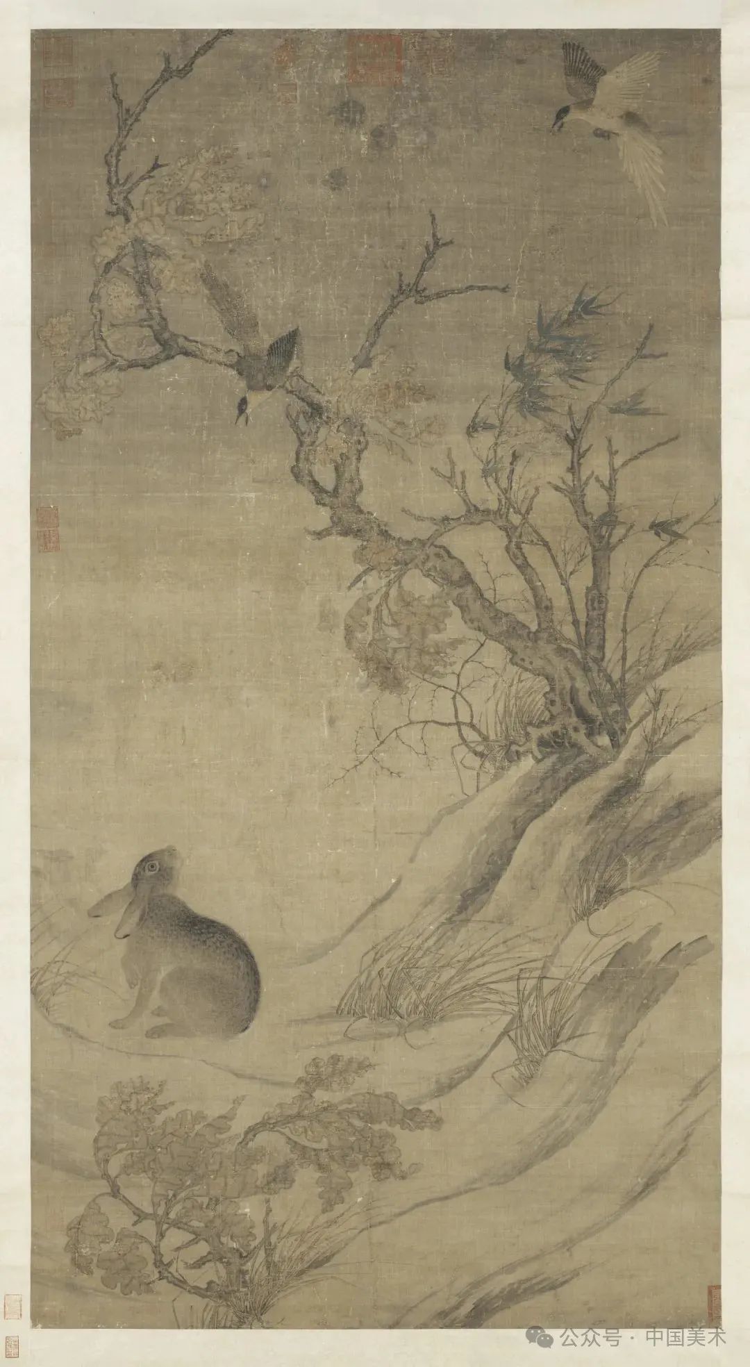 崔白的《双喜图轴》在空间结构上,与黄居寀有相似之处。但是,兔子的画法显得温润、柔和,环境皴染用墨较清淡,用笔松弛概括。