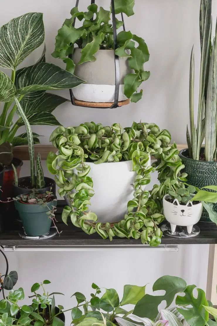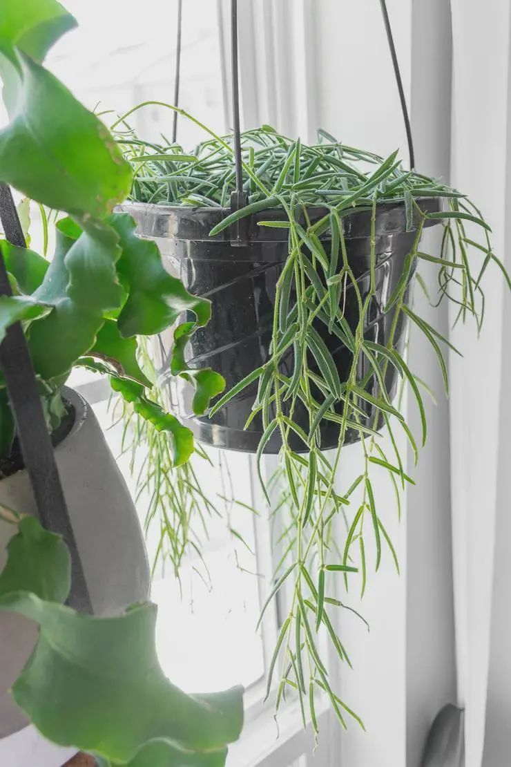 卷叶球兰的叶子非常特别,形态就和海带一般,弯弯曲曲地悬挂在花盆上,茎叶长到一起,形成绳索打结一般的外观。