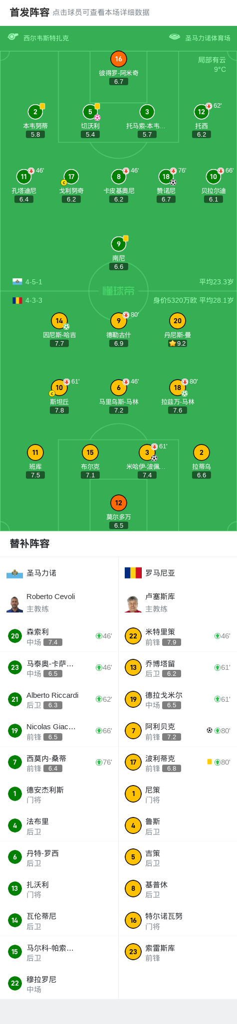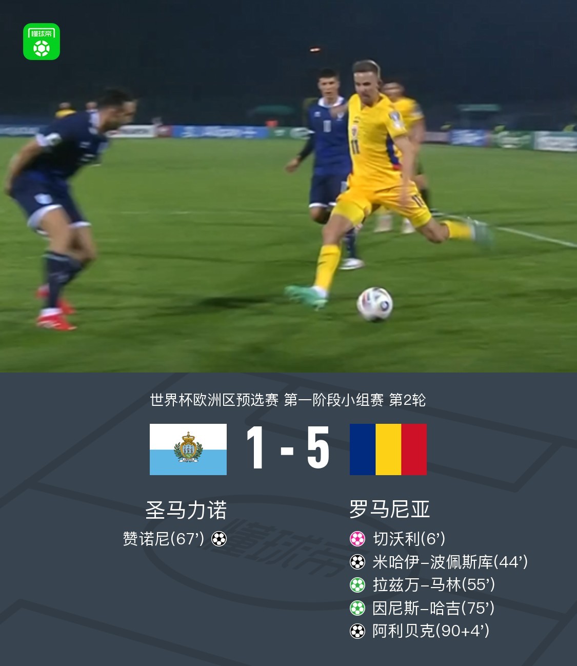 在世界杯欧洲区预选赛第一阶段小组赛第二轮的一场较量中,圣马力诺与罗马尼亚展开对决。比赛中,圣马力诺的切沃利不慎将球送入自家球门,而赞诺尼则凭借森索利的助攻为球队扳回一城。罗马尼亚方面,米哈伊-波佩斯库成功破门得分,拉兹万-马林通过点球机会扩大领先优势,因尼斯-哈吉同样在点球中建功,阿利贝克也在比赛尾声阶段锦上添花。最终,全场比赛结束,圣马力诺以1比5不敌罗马尼亚。