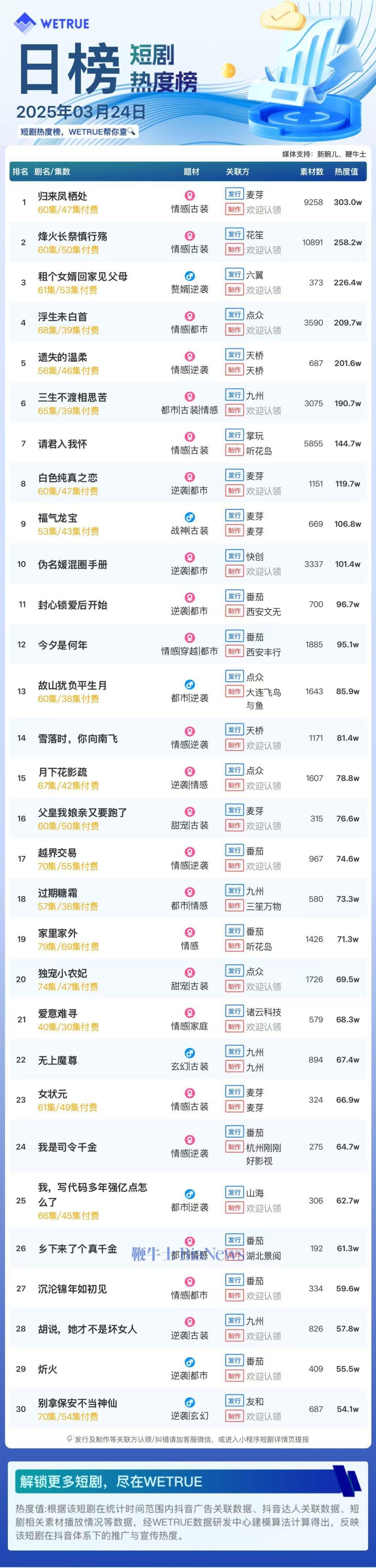 1、本日榜为WETRUE短剧数据公司提供,新腕儿和鞭牛士提供联合支持。