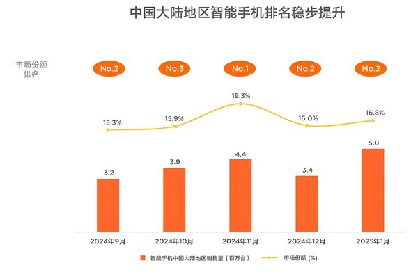 【CNMO科技消息】根据小米官方公布的数据,小米手机在中国大陆地区的排名稳步提升,从2024年9月到2025年1月,小米手机市场份额最低为15.3%,最高达到19.3%,并在2024年11月登顶。从排名来看,这五个月小米手机在国内的排名均没有掉出过前三。