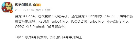 骁龙8s Gen4的新机型预计将在4月中旬陆续发布,以下是部分已知的机型:REDMI Turbo 4 Pro有望首发搭载骁龙8s Gen4,7500mAh±超大电池已确定落地;iQOO Z10 Turbo Pro搭载120W快充,7000mAh±大电池;小米 Civi 5 Pro配备了大底主摄+长焦,预计影像表现会有惊喜;OPPO K13 Pro也将搭载骁龙 8s Gen4,配备主动散热的内置风扇+RGB,电池容量目前设定为7000mAh+。