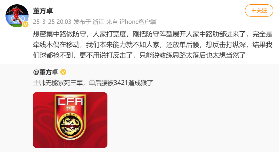 前国脚董方卓发文:“主帅无能累死三军,单后腰被3421遛成猴了。”