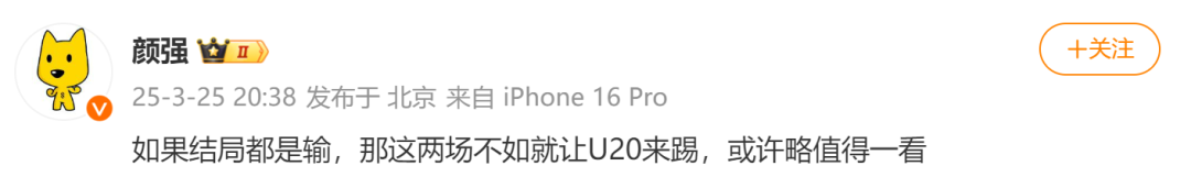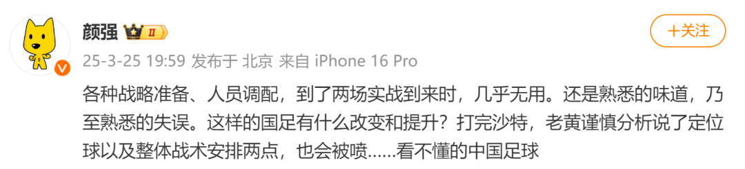 知名足球解说员颜强发文:“各种战略准备、人员调配,到了两场实战到来时,几乎无用。还是熟悉的味道,乃至熟悉的失误。这样的国足有什么改变和提升?打完沙特,老黄谨慎分析说了定位球以及整体战术安排两点,也会被喷……看不懂的中国足球。”