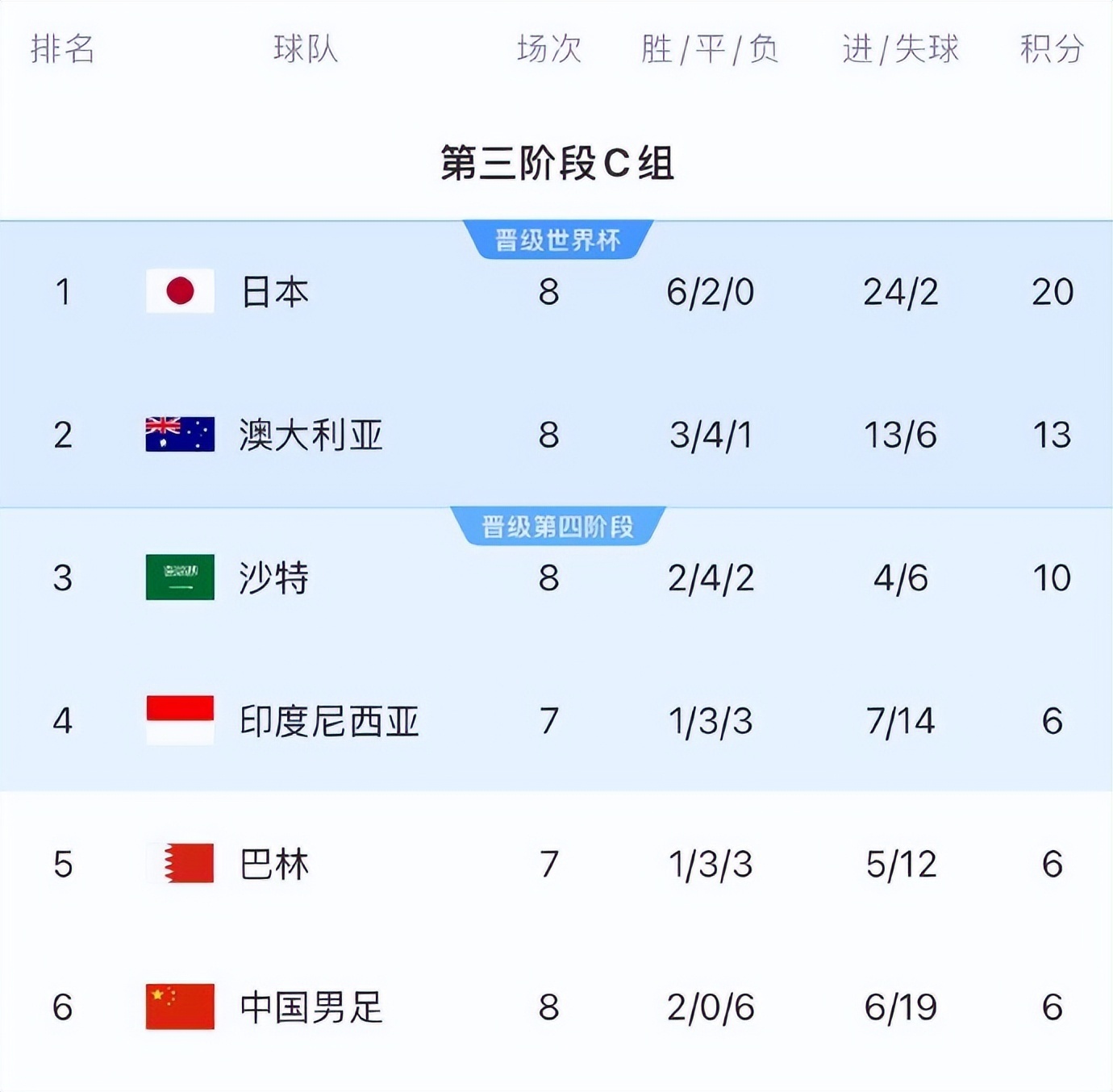 此役过后,国足已遭遇世预赛三连败,以8战2胜6负积6分净胜球-13个的成绩继续排在C组垫底的位置,澳大利亚则以13分的成绩继续排名小组第二。