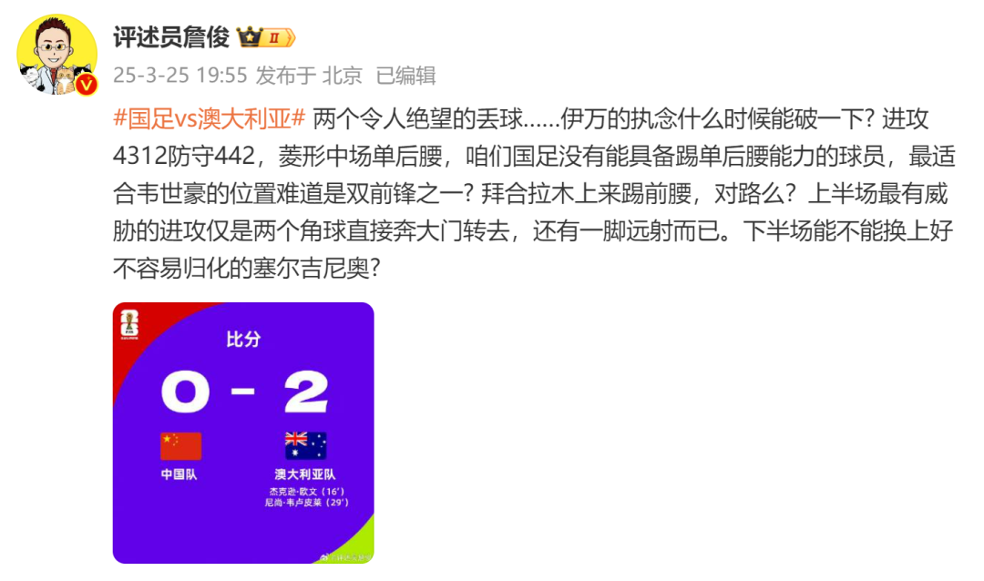 知名体育评论员詹俊发文:“两个令人绝望的丢球……伊万执念什么时候能破一下? 进攻4312防守442,菱形中场单后腰,咱们国足没有能具备踢单后腰能力的球员,最适合韦世豪的位置难道是双前锋之一? 拜合拉木上来踢前腰,对路么?上半场最有威胁的进攻仅是两个角球直接奔大门转去,还有一脚远射而已。下半场能不能换上好不容易归化的塞尔吉尼奥?”