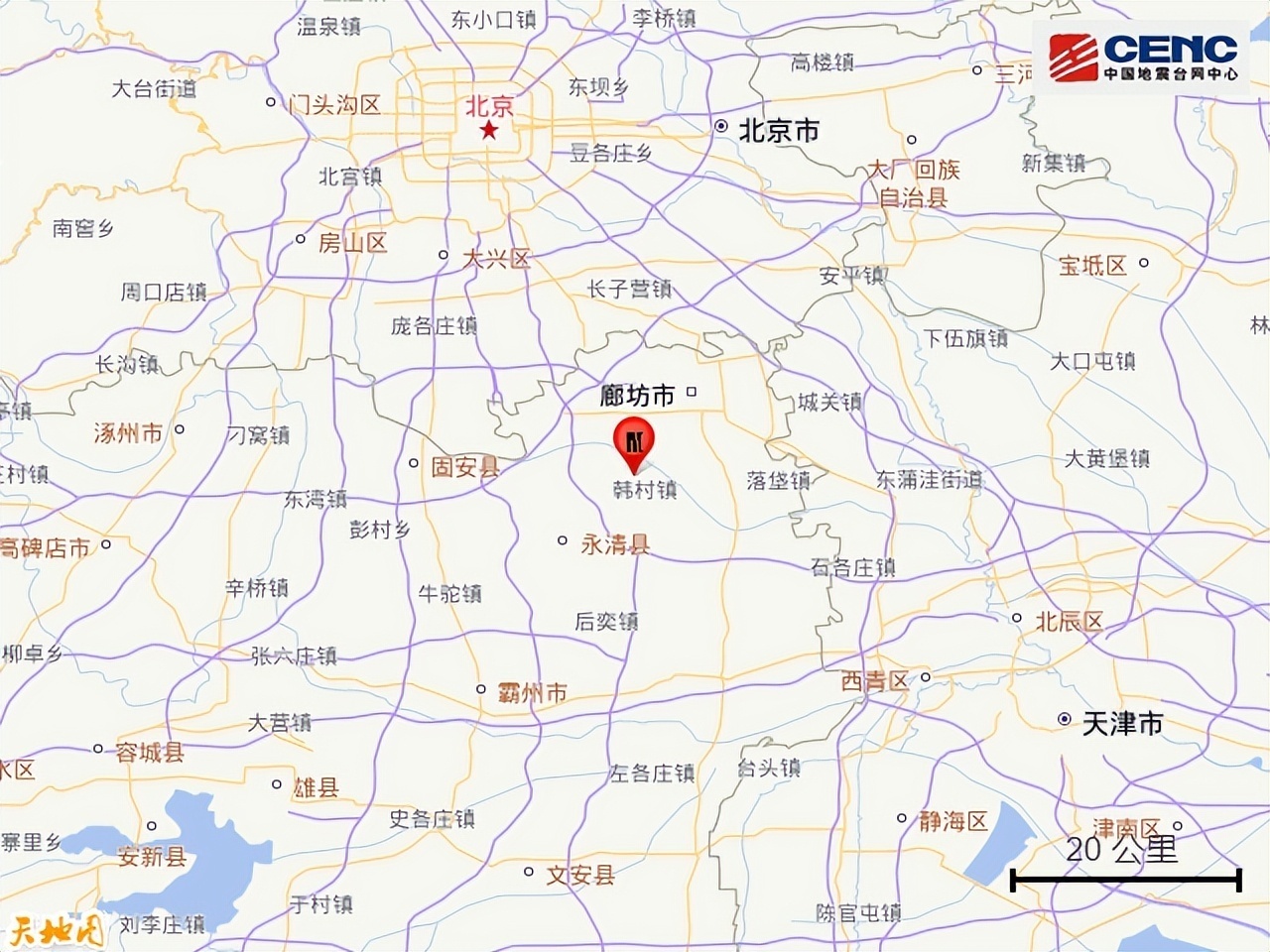 中国地震台网正式测定:3月26日1时21分,在河北廊坊市永清县(北纬39.42度,东经116.60度)发生4.2级地震,震源深度20公里。