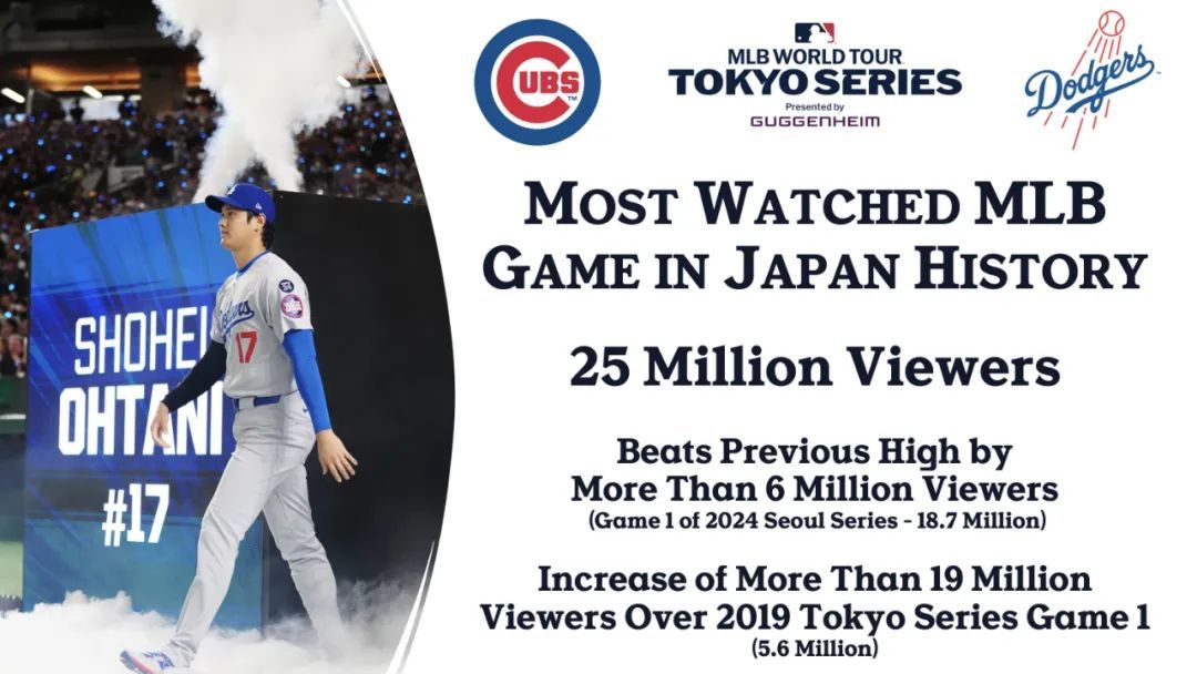 道奇与小熊的东京揭幕战第一战,各平台直播收视人数达到2500万,创下了MLB比赛在日本的收视新高,比2024首尔系列赛第一战高出600多万观众,比2019年东京赛第一场高出1900万观众。其中在关东地区,此战缔造强劲的收视率,家庭收视率达到31.2%(个人19.9%),最高峰时段出现在晚间8点半,达到35.7%,也就是道奇第5局反攻拿下3分的时段,大谷翔平与队友连续安打超前小熊。这场比赛的收视率超越先前道奇vs读卖巨人的热身赛,当时为22.9%,今年的收视率仅次于年初《箱根驿传》(全称:东京箱根间往复大学驿传竞走)的28.8%。现在MLB大联盟的揭幕战登上日本今年收视最高的节目了。