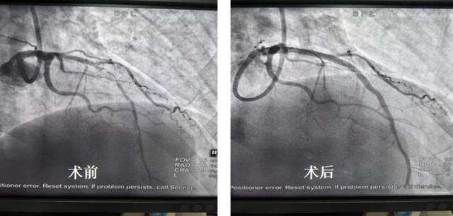 本例患者因左前降支近段严重钙化狭窄,在当地医院尝试常规介入治疗失败,每日胸痛发作频繁,只要下地走路就会诱发胸痛,生活受到严重困扰。接受冠脉旋磨后,血管狭窄得到有效改善,术后次日即可正常下床活动。(该患者术前、术后造影对比图)
