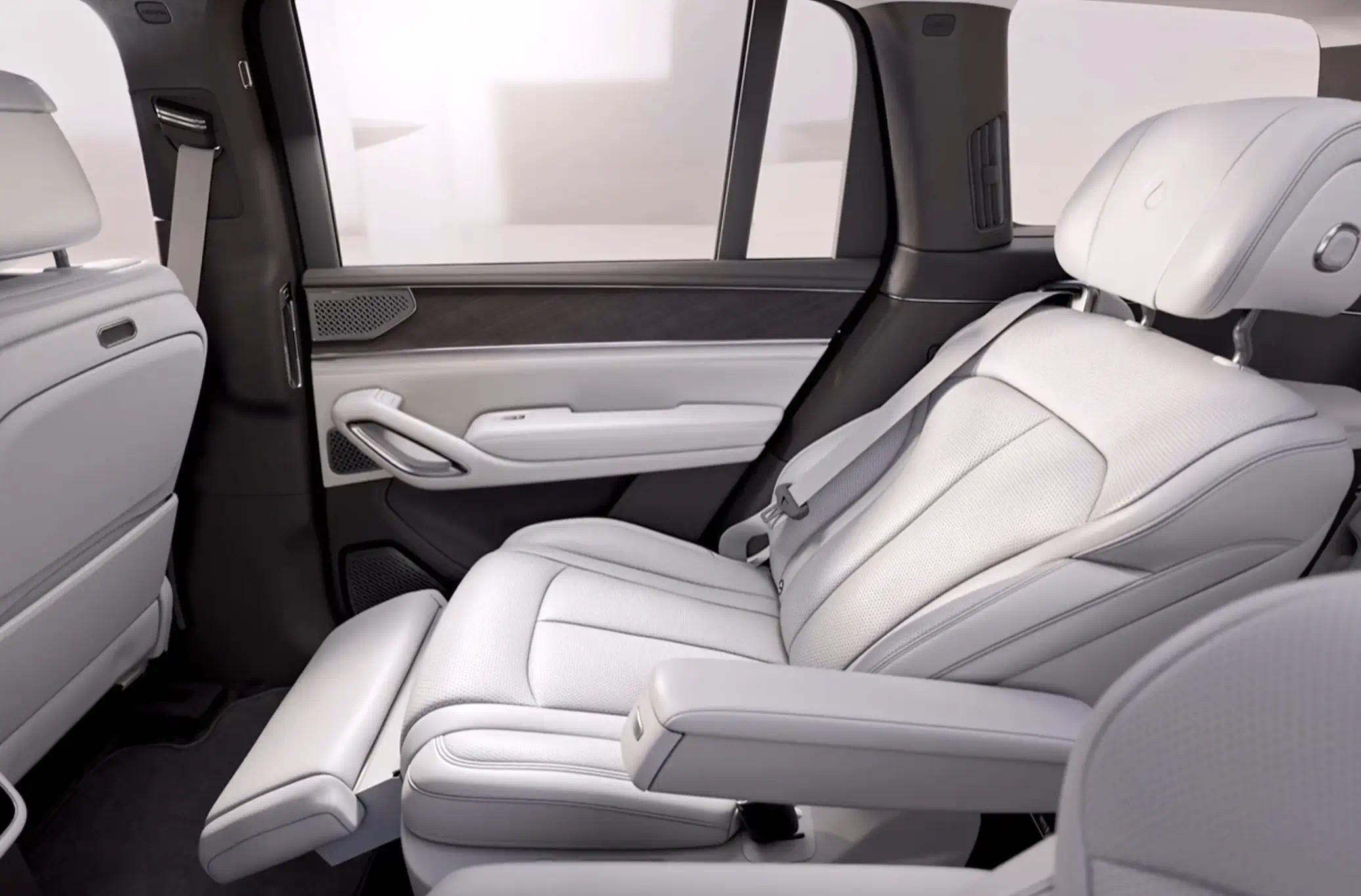 内饰尽显豪华。中控台及门板采用木纹材质饰板,17.3 英寸悬浮式中控屏十分夺目,两侧对称分布 12.3 英寸全液晶仪表与副驾娱乐屏。全新四辐式方向盘搭配怀挡换挡机构,操作便捷。副仪表台有双 50 瓦手机无线充电面板,前方水晶材质拨杆与实体按键,精致感十足。