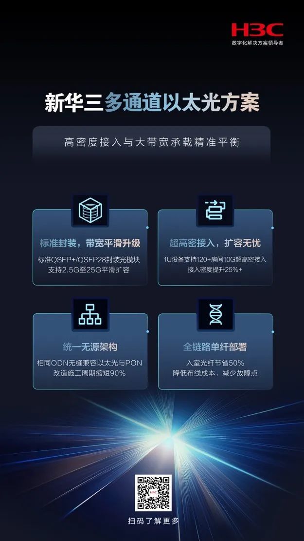 新华三集团此次推出的多通道以太光方案,融合了光通信领域的前沿技术,不仅延续了企业级网络的高性能,还在架构精简上取得了创新突破,显著降低了网络建设与运维成本,实现了网络容量升级与全生命周期成本优化的双重提升。