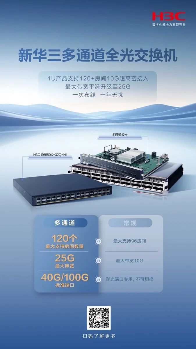 超高密接入,扩容无忧:新华三多通道交换机具备卓越的高密度接入能力,1U设备可支持120个以上房间的万兆并发接入,端口密度较传统方案提升25%以上。同时,框式多通道交换机可灵活扩展,以满足更高接入密度需求,并与普通以太光网络实现高效融合,适配多样化组网场景。