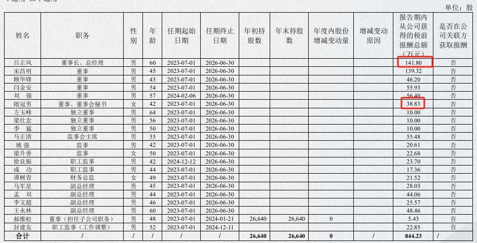 高管薪酬方面,董事长、总经理吕正风薪酬141.8万元,上一年薪酬为120.31万元,涨薪21.49万元。董事会秘书隋冠男薪酬38.83万元,上一年薪酬为30.63万元,涨薪8.2万元。