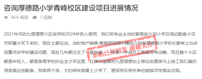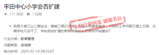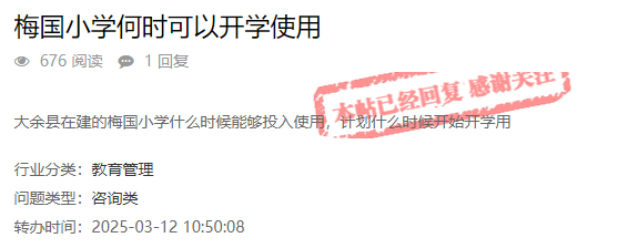 经调查核实,吉祥路小学目前已完成平场,项目建设已纳入2025年建设计划,正在筹措资金推动开工建设。3月13日已与反映人电话联系,就其咨询问题进行答复,反映人表示认可。