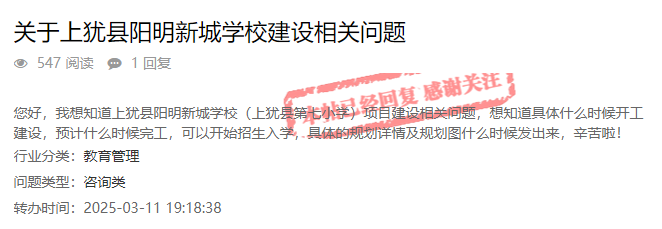 上犹县阳明学校场地平整工程于2024年9月进场施工,预计今年5月可以完成场地平整。学校建设分两期进行,一期主要建设内容为教学楼及室外周边部分配套工程,已于2025年2月完成公开招标,场地平整到位后可以进场施工。二期工程已完成了施工图纸设计、审核、预算编制等工作。学校二期项目建设预计2027年可以完成,项目完成后将尽快招生开学,投入使用。项目的建设指标、效果图已在项目建设地进行了公开公示。