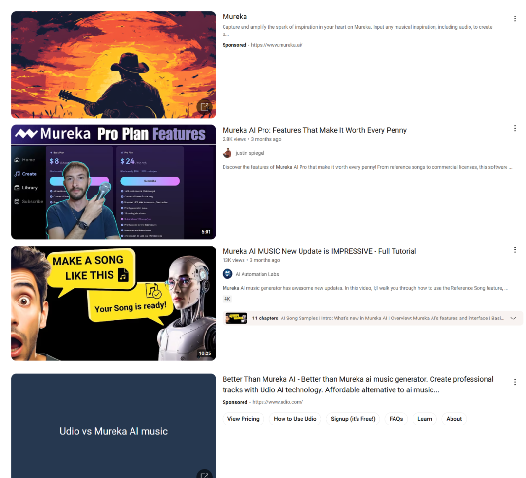如果在YouTube搜索Mureka,就能发现已经有很多创作者在用这款产品创作音乐了,这和很多AI概念产品的扩散路径——先由技术社区引爆,再去寻找应用场景——还不太一样,是市场先行、「炸裂」后至。