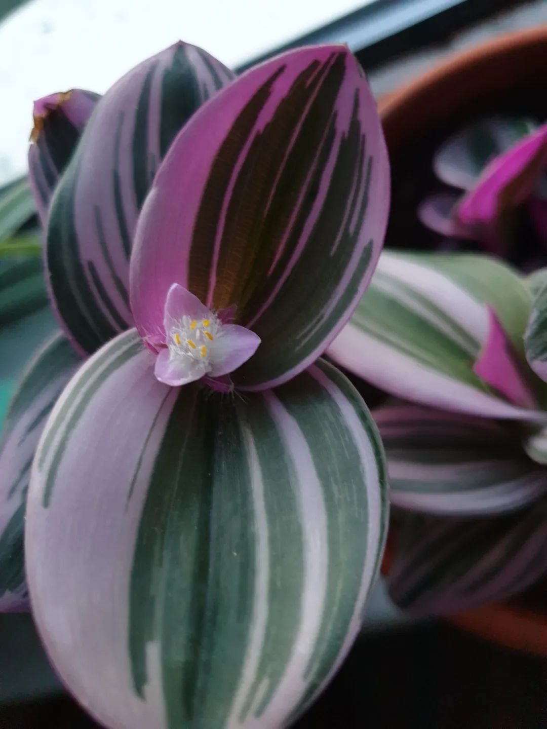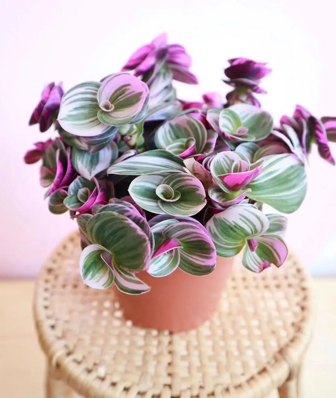 油画婚礼是鸭跖草科紫露草属的一种观叶植物,叶子斑斓亮丽,是很受欢迎的一种网红植物。油画婚礼吊兰的叶片看起来像油画,一般叶子背面是紫色的,叶面上则会有粉色、深绿色和白色相间的斑纹,观赏性特别好,且叶子圆润,茎叶和花上都有细软的绒毛,很是可爱。