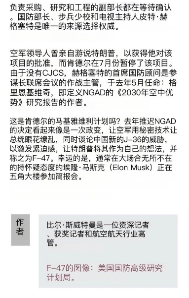 更有意思的是,美国空军六代机NGAD之前是处于暂停状态的。从美国空军领导层的发言可以看出,暂停理由并不复杂,因为规划中的六代机太贵了,一架有可能超过三亿美元,就算是财大气粗的美军,也着实遭不住,所以需要考虑替代方案。但是在中国试飞两款六代机之后,美国很明显是坐不住了,所以才有这次的这一波宣传学表演。