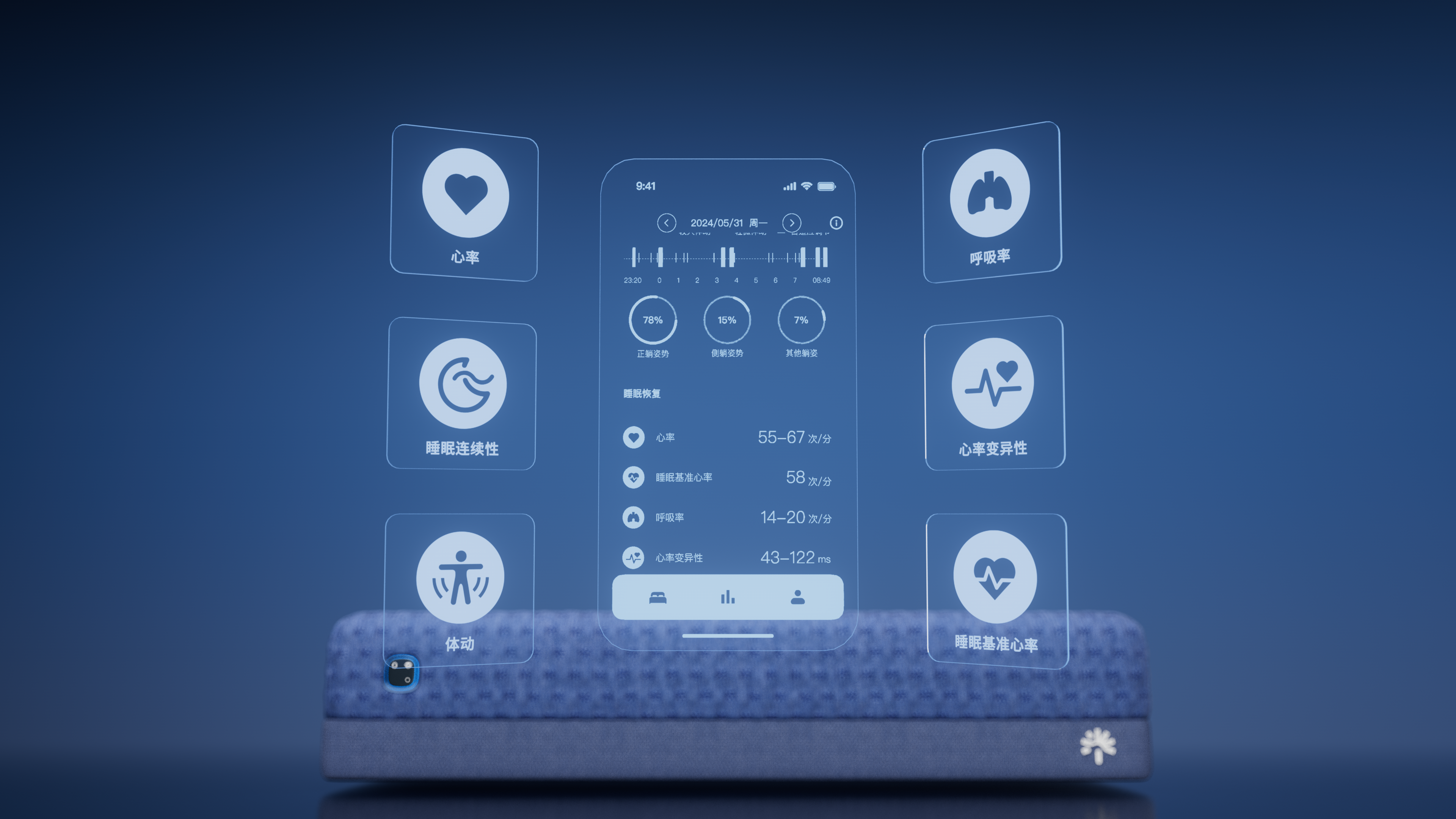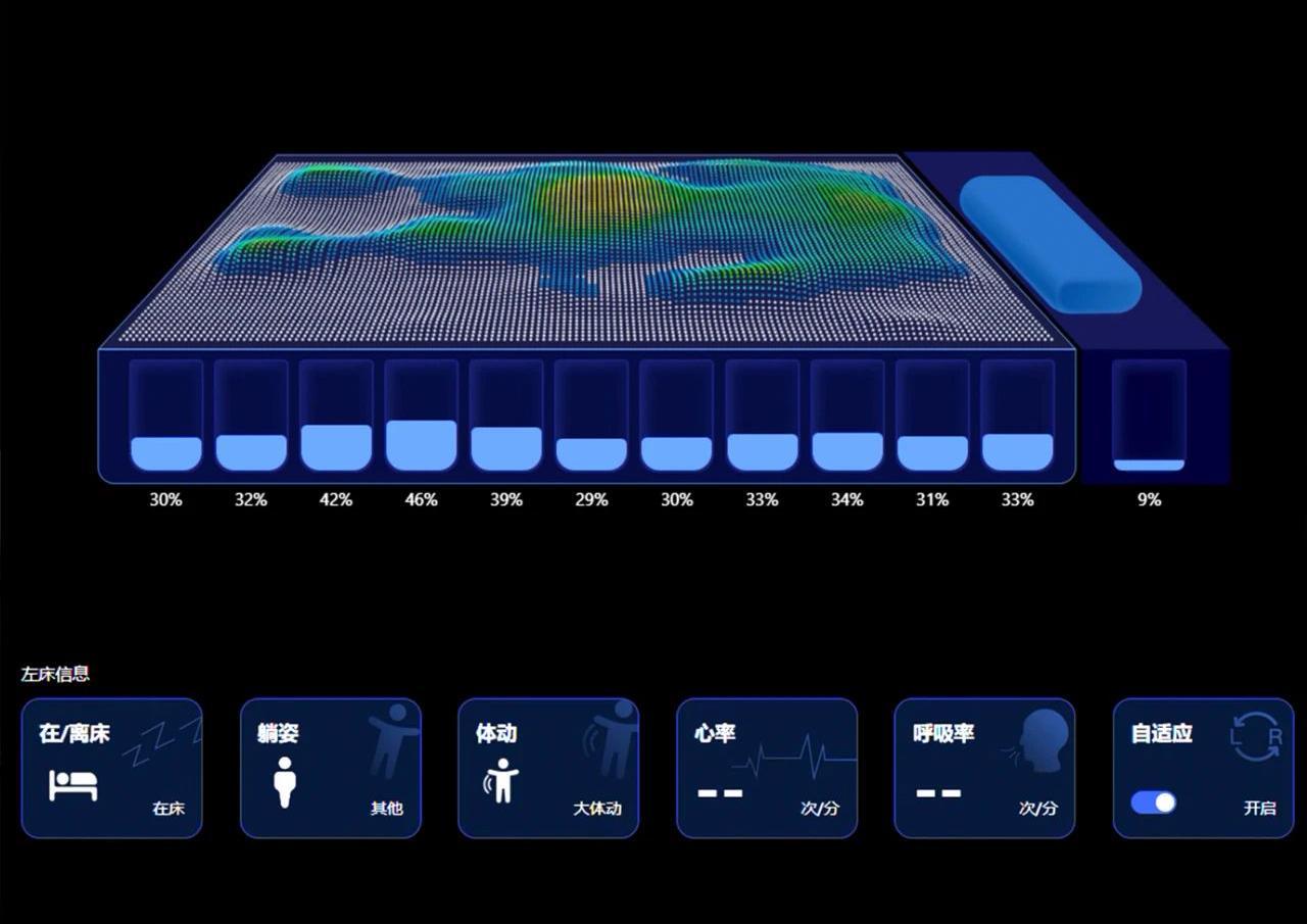 感应与识别技术,由行业内领先数量级的2048个高密度柔性传感器(单侧床1024个),可精准识别躺姿、身体分区及身形曲线,动态跟随睡眠。同时内置高精度生理侦测传感器,实时监测睡眠中体征、动态和行为——两个传感器同时作为健康洞察的核心硬件。