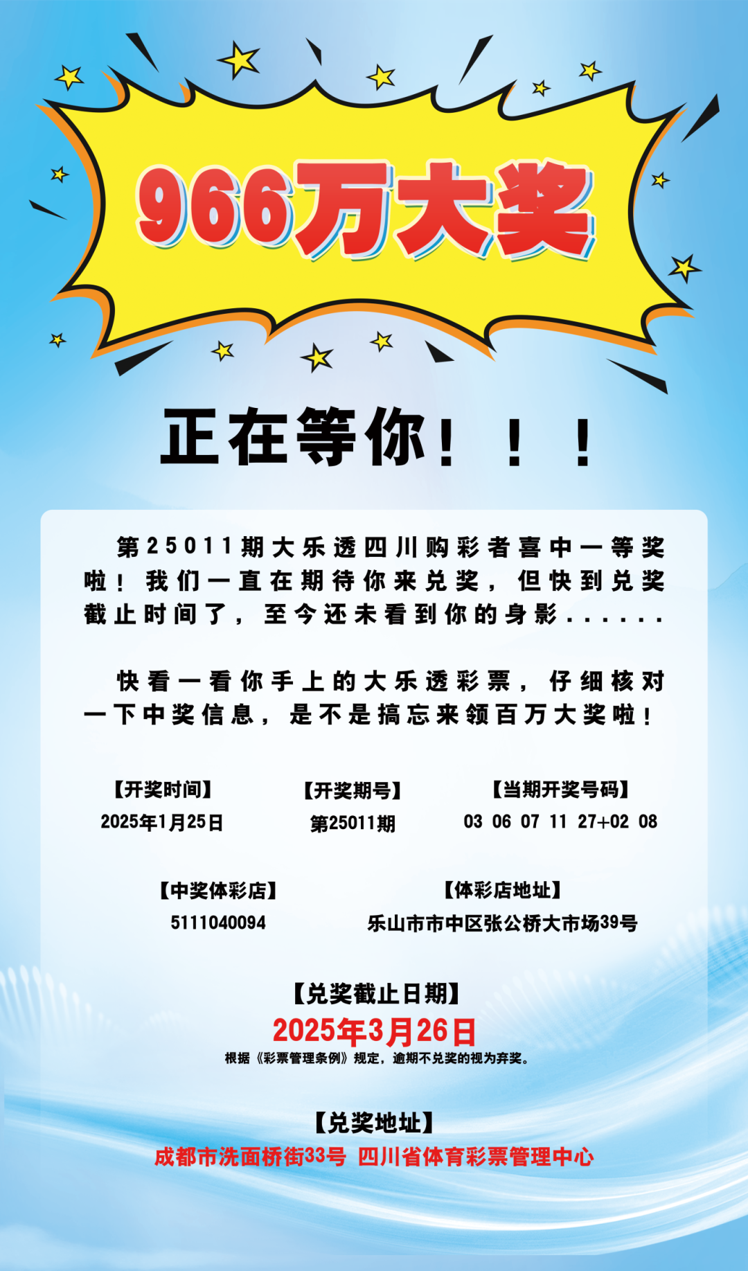 近日,四川省体育彩票管理中心公众号发布消息,1月25日开奖的大乐透第25011期,乐山市张公桥大市场39号体彩店中出1注一等奖,奖金966万元,但中奖幸运儿一直没有领奖。