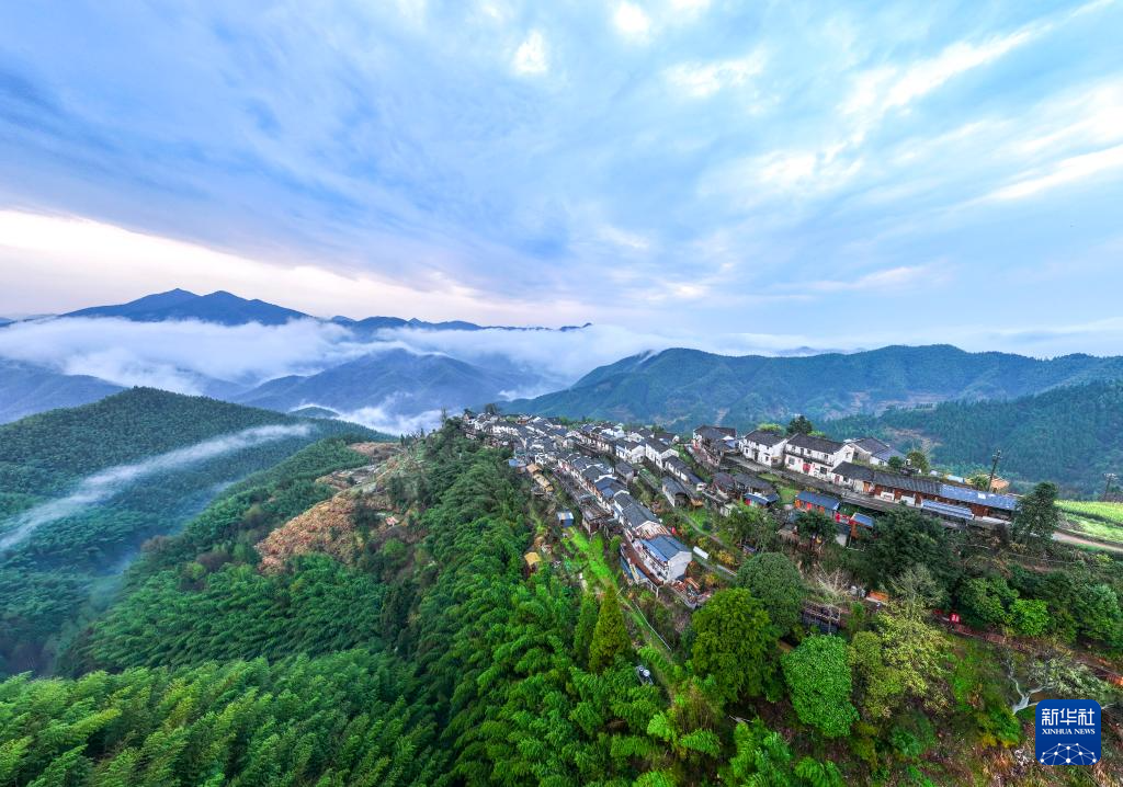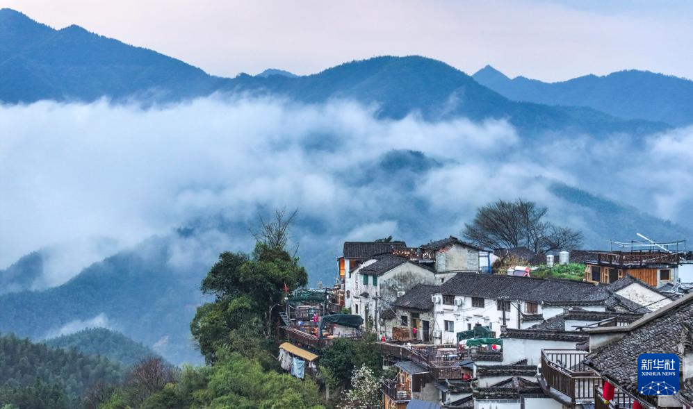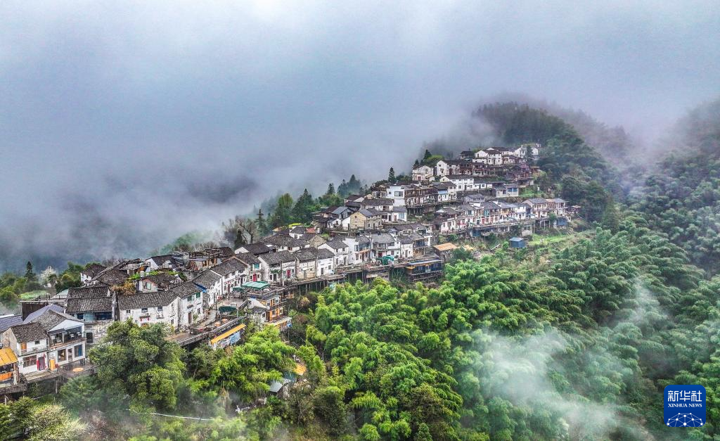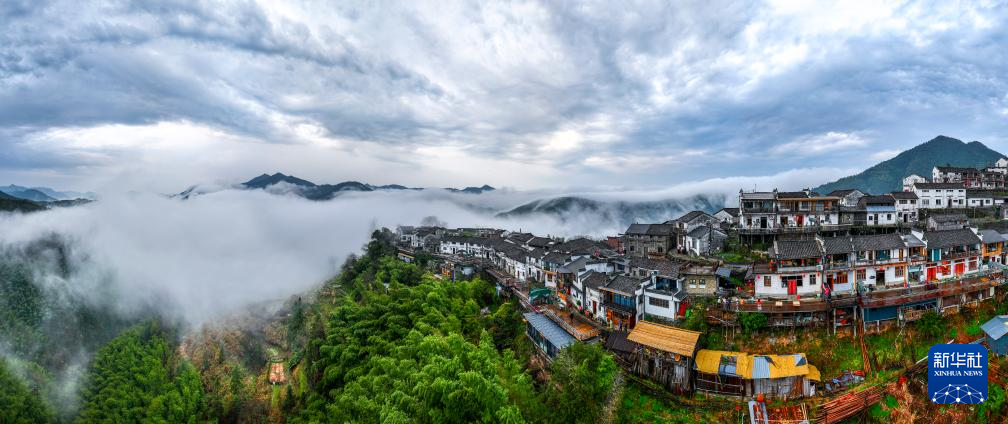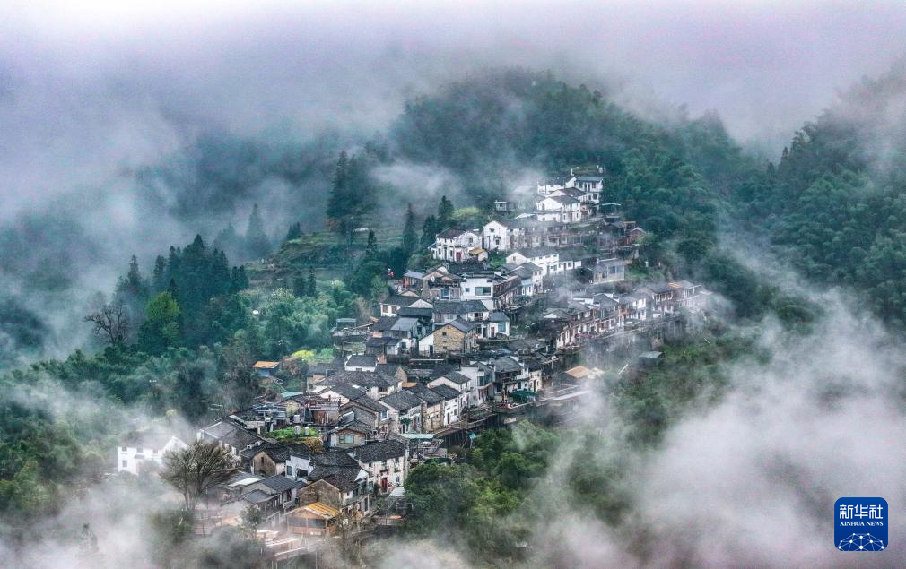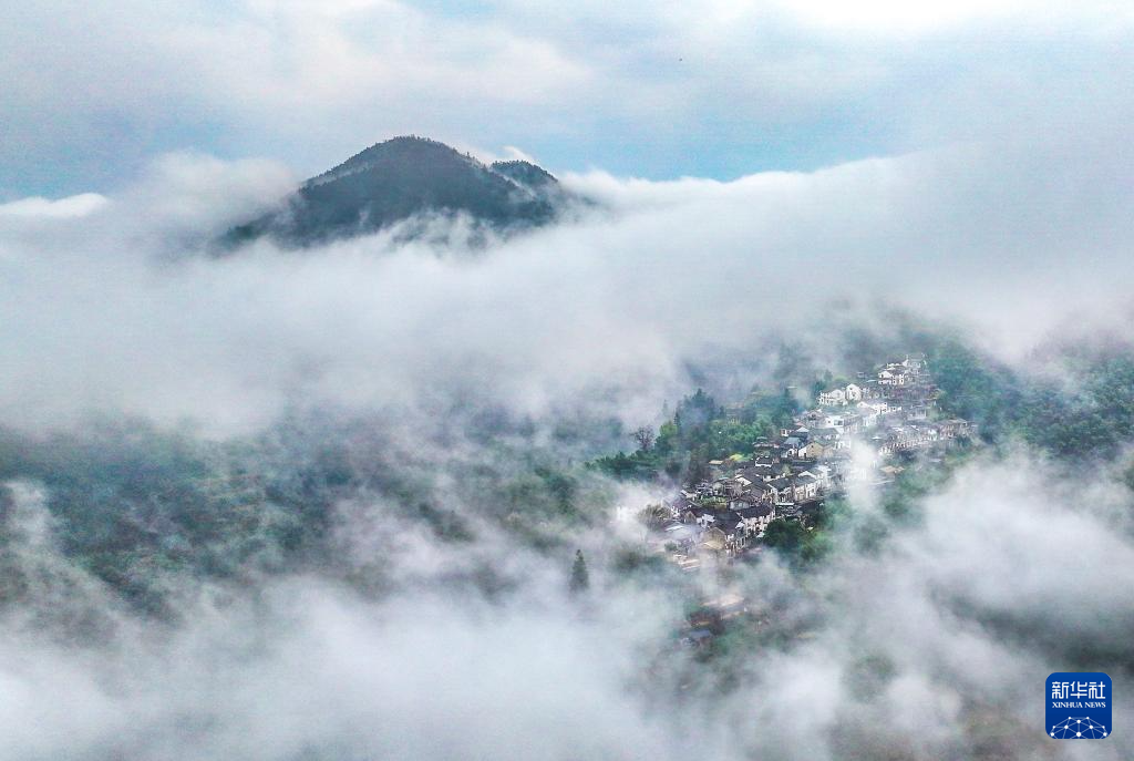 一场春雨过后,在安徽省黄山市休宁县溪口镇,依山而建的徽派古村落木梨硔村云雾缭绕,错落有致的民居若隐若现,宛如仙境。
