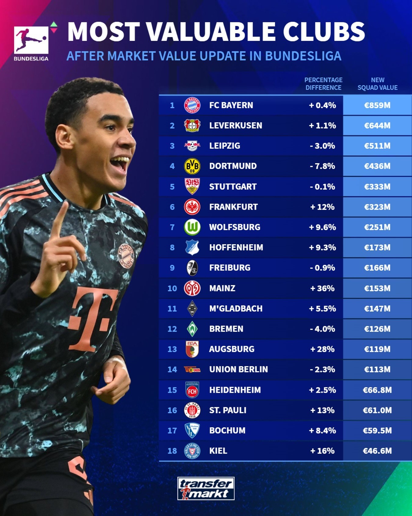 在更新了德甲球员身价后,德国转会市场网站列出了德甲球队身价榜,拜仁以8.59亿欧居首,勒沃库森排名第二,莱比锡位列第三,多特蒙德位居第四。