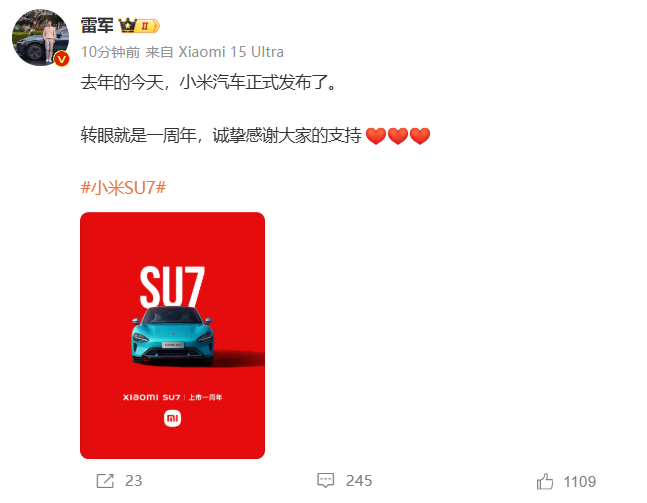 3月28日是小米汽车发布一周年的纪念日。当天,雷军在社媒发文:“去年的今天,小米汽车正式发布了。转眼就是一周年,诚挚感谢大家的支持。”