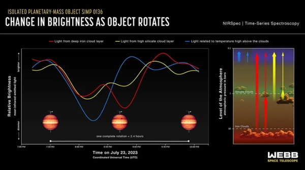 此前的观测显示,SIMP 0136的亮度会发生变化,但原因一直不明。通过分析詹姆斯·韦布空间望远镜的新数据,研究人员发现,某些红外波长(图中红色部分)来自行星大气层最深处的蒸发铁分子云,而另一些红外波长(图中黄色部分)则来自行星上层大气中的硅酸盐矿物颗粒云。这些云层的不均匀性被认为是导致SIMP 0136亮度变化的原因。