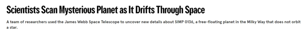 据外媒报道,波士顿大学与其他机构的研究人员组成的研究团队,借助詹姆斯·韦布空间望远镜(James Webb Space Telescope)对SIMP 0136进行了详细观测。SIMP 0136是一颗在银河系中自由漂泊的行星,距离地球约20光年,其质量约为木星的13倍,具有类似气态巨行星的结构和化学成分,但其真实特性尚未完全确定。