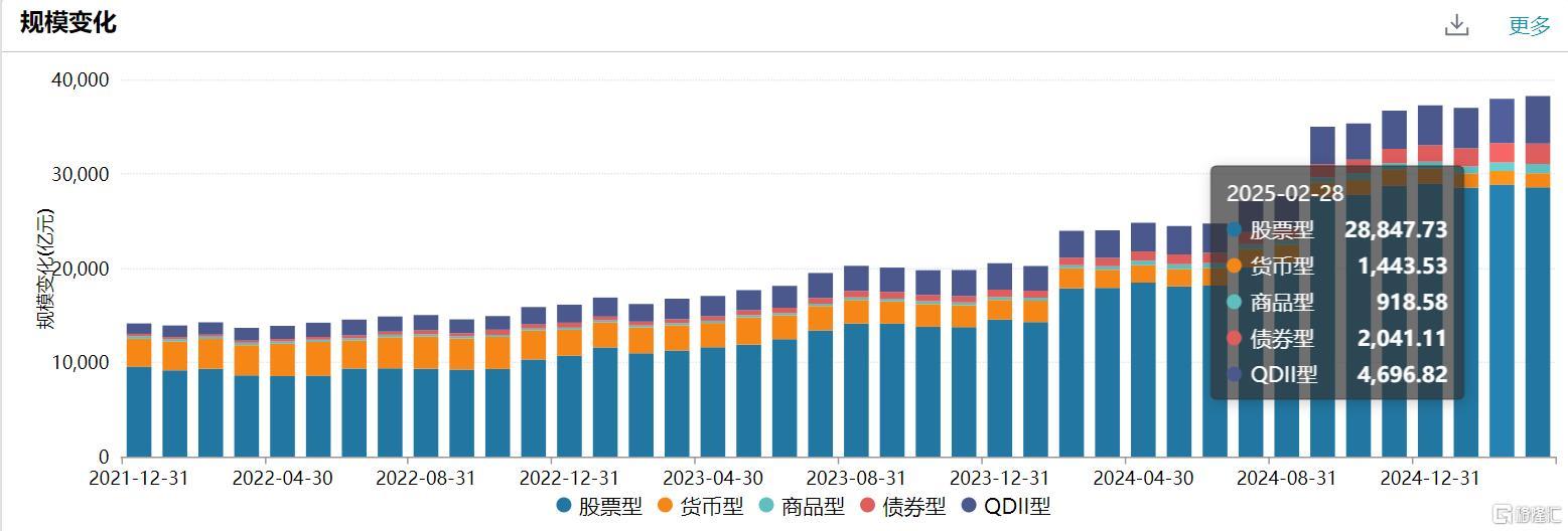 这或许与港A股2月的AI、机器人等主题行情的大涨中,混合基金净值大幅提升规模有关,因为混合基金份额继1月赎回646.66亿份后,2月继续净赎回210.38亿份。