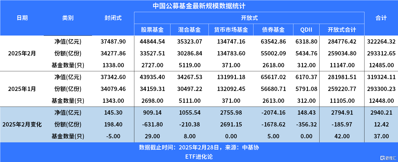 中基协最新发布公募基金市场数据。截至2025年2月底,我国境内公募基金管理机构共163家,管理公募基金总规模合计为32.23万亿元,重回32万亿元之上,环比增长 0.92%。这一增长主要由权益市场回暖驱动,各类型基金呈现差异化表现: