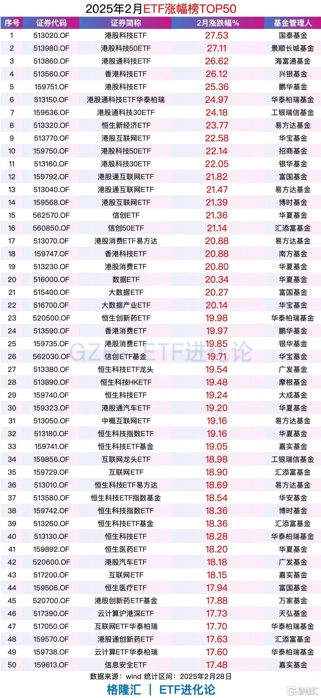 恒生科技指数2月上涨 25%,多只港股ETF涨幅超20%。港股科技50ETF、港股通科技ETF、香港科技ETF、恒生新经济ETF、港股互联网ETF、港股通互联网ETF均涨超20%。