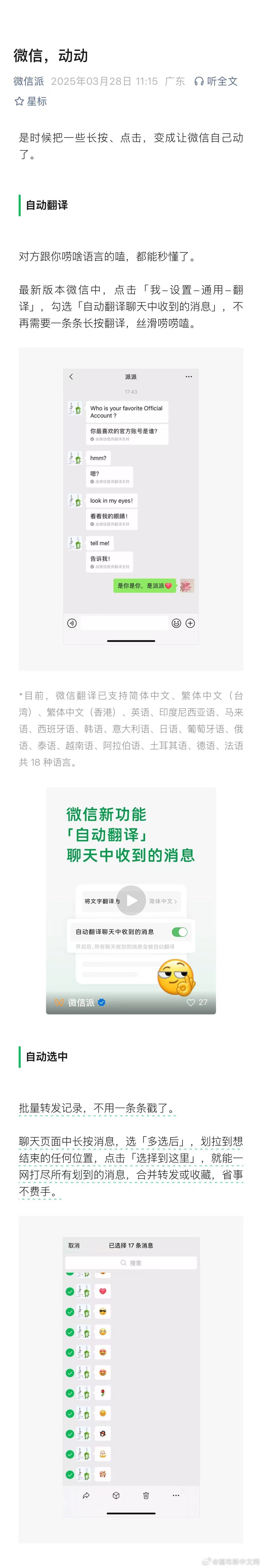 #微信能自动翻译聊天消息了#【#微信不再需要逐条长按翻译#】据“微信派”公众号消息,最新版本微信中,点击「我-设置-通用-翻译」,勾选「自动翻译聊天中收到的消息」,不再需要一条条长按翻译。