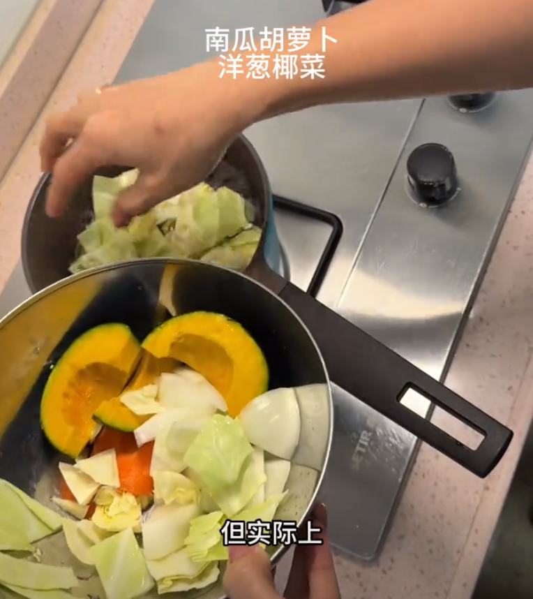在习惯自己做饭的人看来,这道菜的做法简单到堪称幼儿园水平:只需要把南瓜、洋葱、圆白菜等食材切成块状,按照一定的顺序放锅里煮,连起锅烧油的步骤都用不上。