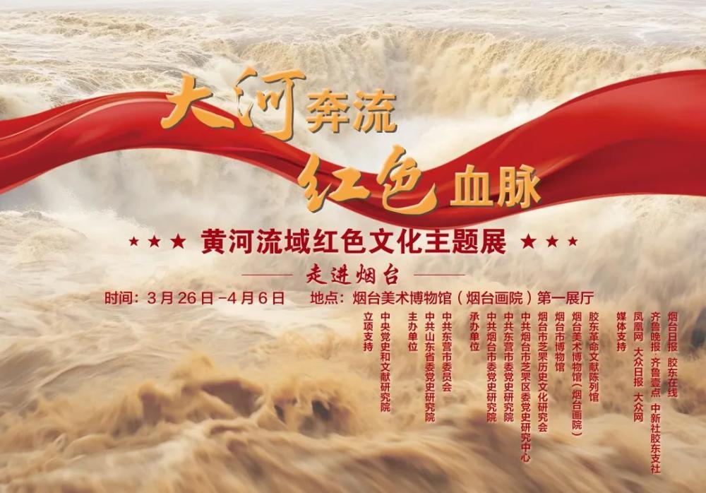 “‘大河奔流 红色血脉——黄河流域红色文化主题展’走进烟台”活动由中央党史和文献研究院立项支持,中共山东省委党史研究院、中共东营市委主办,中共烟台市委党史研究院、中共东营市委党史研究院、中共烟台市芝罘区委党史研究中心、烟台市芝罘历史文化研究会、烟台市博物馆、烟台美术博物馆(烟台画院)、胶东革命文献陈列馆承办,凤凰网、大众日报、大众网、齐鲁晚报·齐鲁壹点、中新社胶东支社、烟台日报、胶东在线媒体支持,将于2025年3月26日上午11点在烟台美术博物馆一楼第一展厅开展。