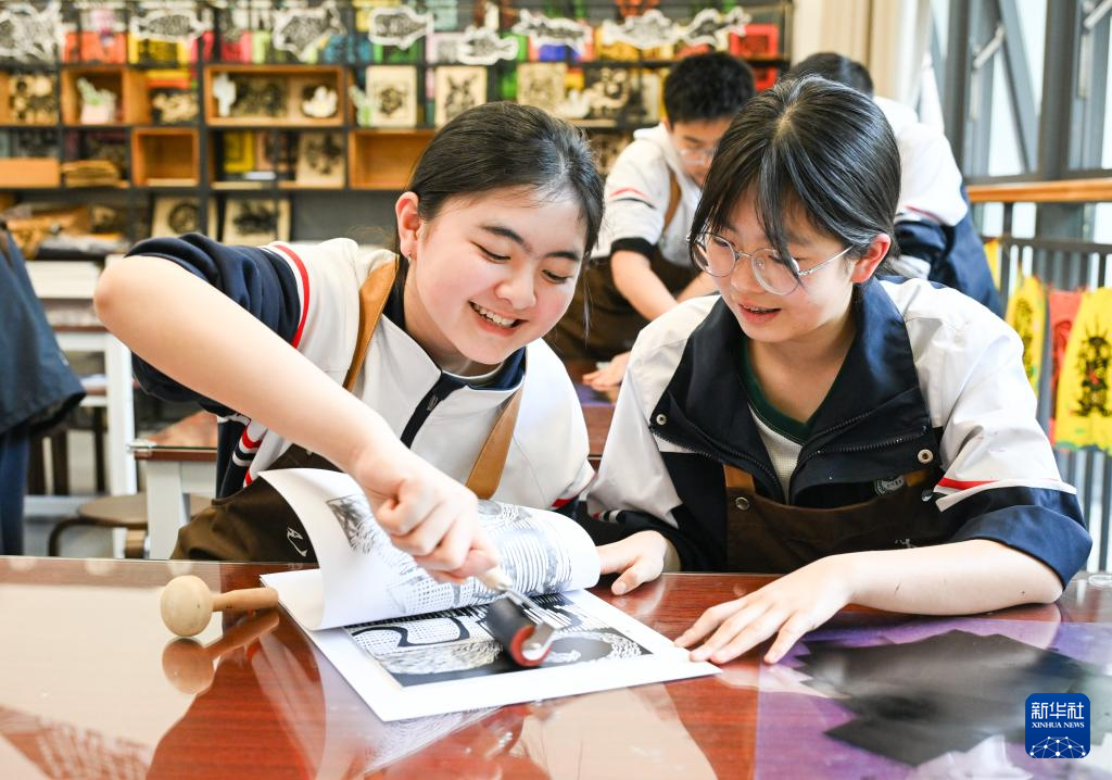 3月27日,在江北区的重庆巴川量子学校,版画社团学生在练习版画制作。