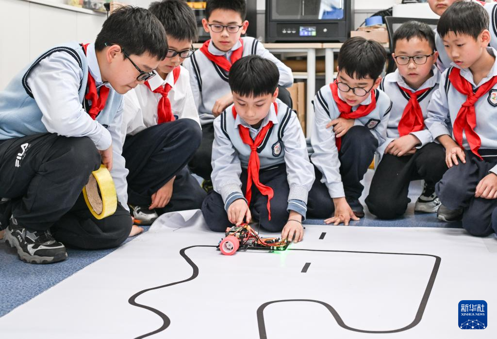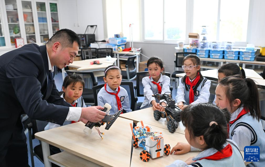 3月27日,重庆市江北区新村同创小学科创社团指导老师(左一)向学生讲解自动化设备运行原理。