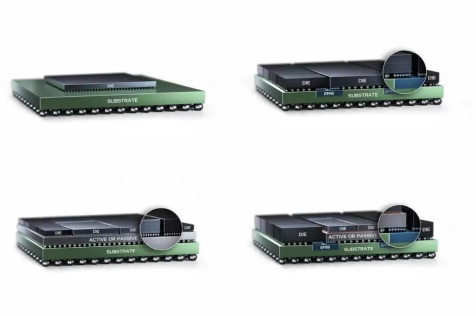 EMIB 3.5D则在此基础上引入了3D堆叠技术,芯片可以垂直堆叠在有源或无源的基板上,再通过EMIB技术连接,增加了堆叠的灵活性,能够根据IP的特性选择垂直或水平堆叠,同时避免使用大型的中介层。