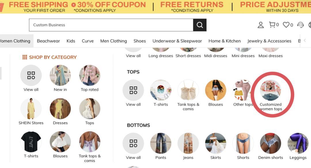 SHEIN首页女装大类,红圈标识的是定制上衣类目的位置 图源:SHEIN截图