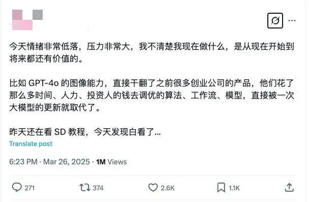 “昨天还在看 SD 教程,今天发现白看了……”知名开发者 Jimmy Cheung 发帖说道,“今天情绪非常低落,压力非常大,我不清楚我现在做什么,是从现在开始到将来都还有价值的。”