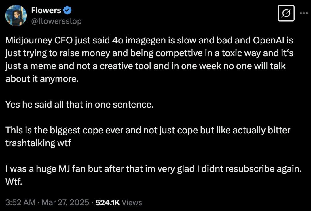 但显然,作为正在遭受“冲击”的 Midjourney 并不这样想。Midjourney CEO David Holz 犀利指出:GPT-4o 的图像生成速度慢、效果又差,OpenAI 只是为了筹集资金,而且在以一种不良竞争的方式行事。这不过是一时的噱头,并非创作工具,不出一周就没人会再谈论它了。