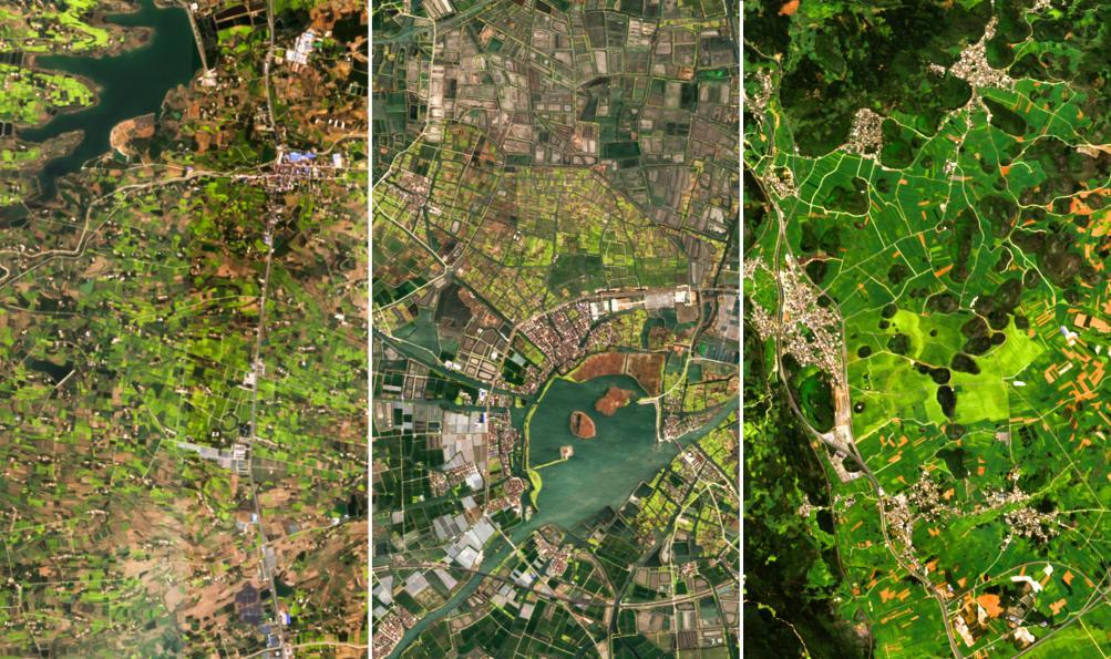 图片中左、中、右分别为近期湖北省沙洋县曾集镇、江苏省兴化市千垛镇、云南省罗平县板桥镇的卫星图像。黄绿相间的图像,多为连片油菜花田。新华社发