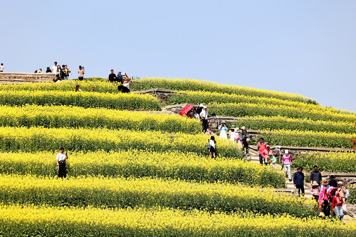 2025年3月21日,游客在浙江省杭州市萧山区所前镇山里王村梯田油菜花海里游玩。新华社发(周方玲摄)