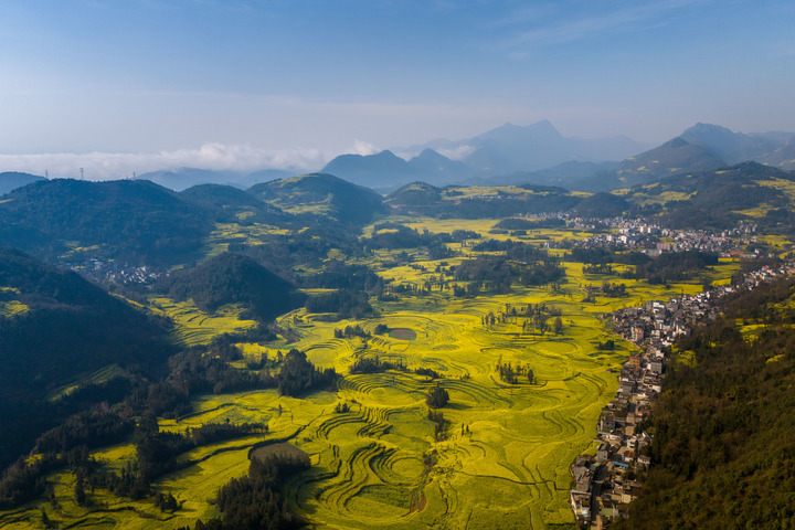 2025年3月11日在云南省罗平县螺丝田拍摄的油菜花海(无人机照片)。新华社发(彭奕凯 摄)