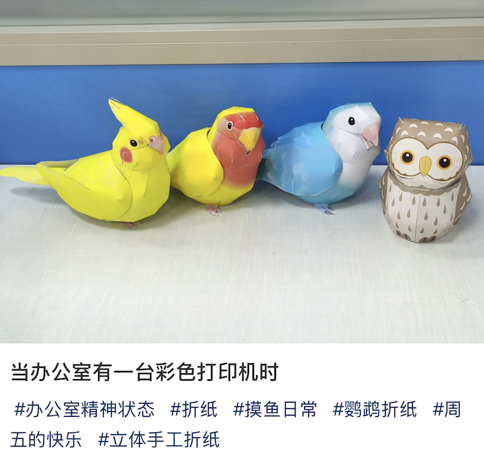 有人形容:“在办公室做纸模有种学生时代上课偷写纸条的惊险,是打工人工作中隐秘的乐趣。”