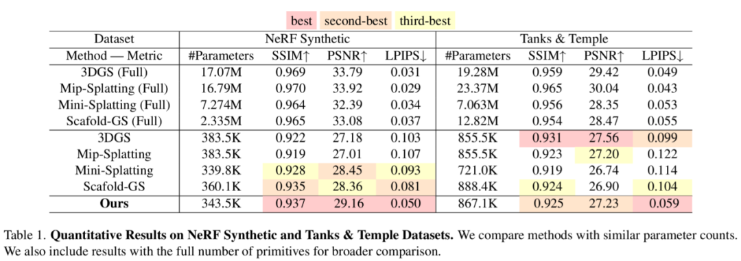 BG-Triangle 在较小的参数量下有渲染质量优势,尤其是在感知质量(LPIPS 评价)上优势显著。