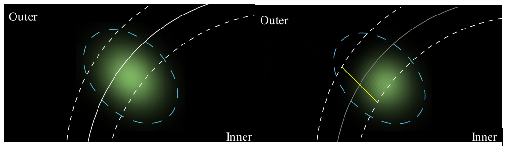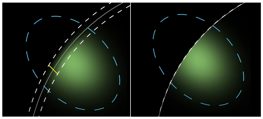 高斯虽然提供了可微的性质,但是其连续的分布无法表达不连续的纹理和几何边界。为此,研究者们使用贝塞尔三角形的渲染轮廓来对高斯的分布进行约束。具体来说,渲染算法会重新计算轮廓边界(图中的白色实线)周围区域(图中虚线之间的区域)的高斯权重,从而降低高斯分布对图元外部区域的影响效果。